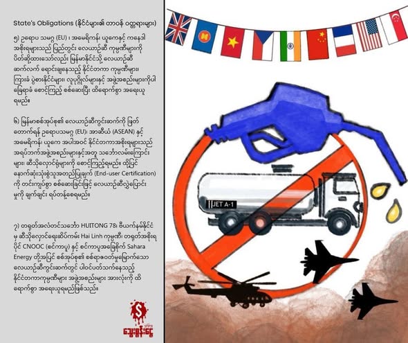 ၄) ၂ဝ၂၄ ခုနှစ် ဧပြီလ ကုလသမဂ္ဂ လူ့အခွင့်အရေးကောင်စီ (UNHRC) က မြန်မာနိုင်ငံအပေါ် ချမှတ်ထားသော လေယာဉ်ဆီတင်ပို့၊ ရောင်းချ၊ လွှဲပြောင်းခြင်းများ ရပ်တန့်ရန် အတည်ပြု တောင်းဆိုထားသည့် ဆုံးဖြတ်ချက်အမှတ် (A/HRC/RES/55/20) ကို ကုလသမဂ္ဂ အဖွဲ့ဝင်နိုင်ငံများ အထူးသဖြင့် အမေရိကန်၊ ယူကေ၊ ဩစတြေးလျ၊ ကနေဒါ၊ ဥရောပ သမဂ္ဂ (EU)၊ အာဆီယံ အဖွဲ့ဝင်နိုင်ငံများ၊ တရုတ်နှင့် အိန္ဒိယနိုင်ငံ အစိုးရများက လိုက်နာ အကောင်အထည်ဖော်ရန် တာဝန်ရှိသည်။