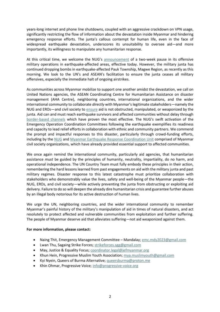 We emphasize that these disaster relief efforts, through any implementing partners, must not be exploited, manipulated, or weaponized by the military junta for its political and military gain.