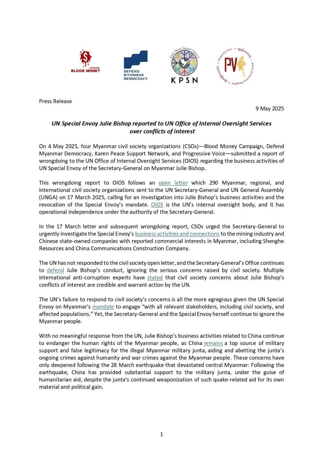 On 4 May 2025, four Myanmar civil society organizations Blood Money – သွေးစွန်းငွေ, Defend Myanmar Democracy, Karen Peace Support Network, and Progressive Voice submitted a ...