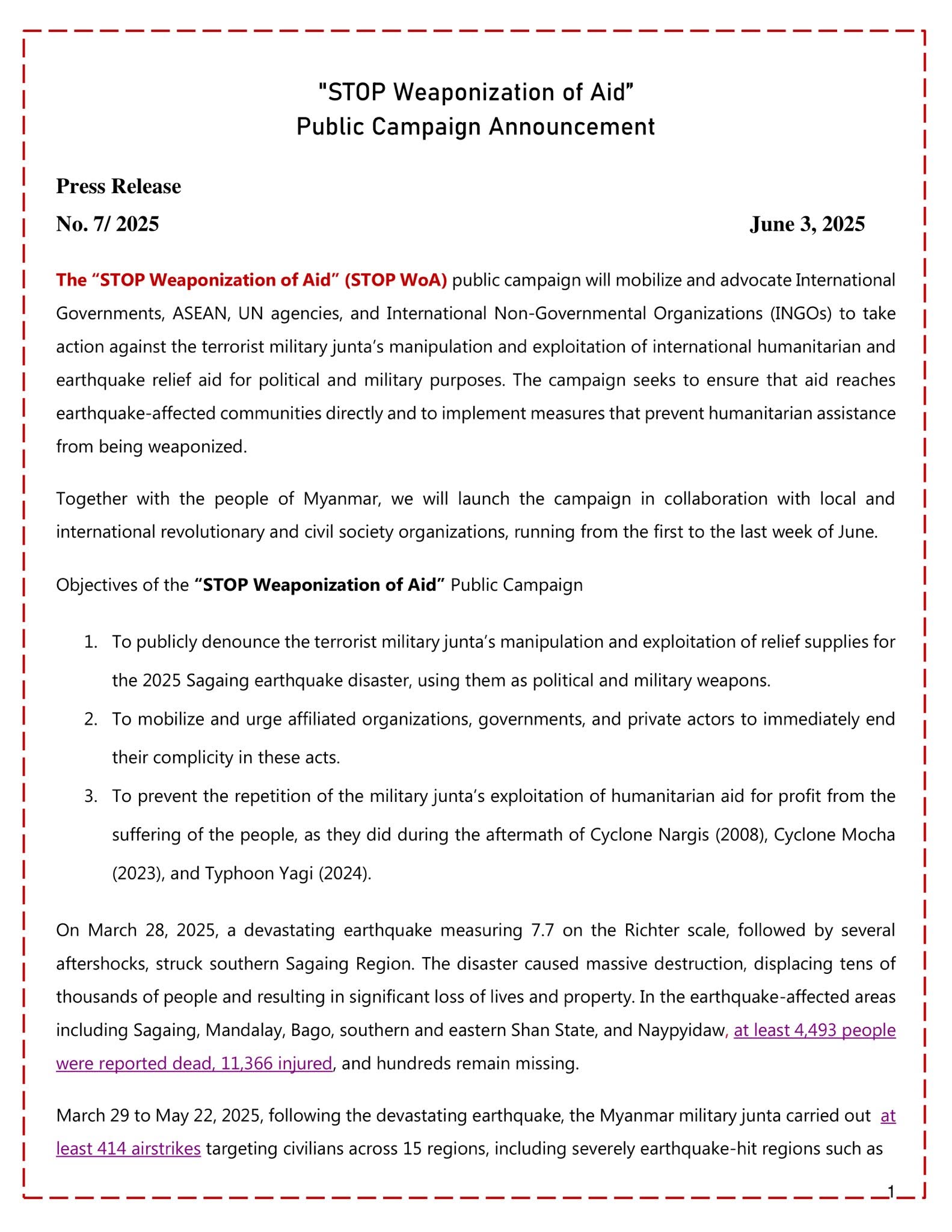အမှတ်စဉ်။ ။ ၇/၂၀၂၅ ဇွန် ၃ ရက်၊ ၂၀၂၅ ခုနှစ်။ “လူသားချင်းစာနာမှု အကူအညီများအား လက်နက်အနေဖြင့် အသုံးချမှု ရပ်” (STOP WoA) လူထု လှုပ်ရှားမှုသည် အကြမ်းဖက် စစ်အုပ်စုမှ နိုင်ငံတကာ အသိုင်းအဝိုင်း နှင့် အဖွဲ့အစည်းများ ပေးပို့သော ငလျင် ...