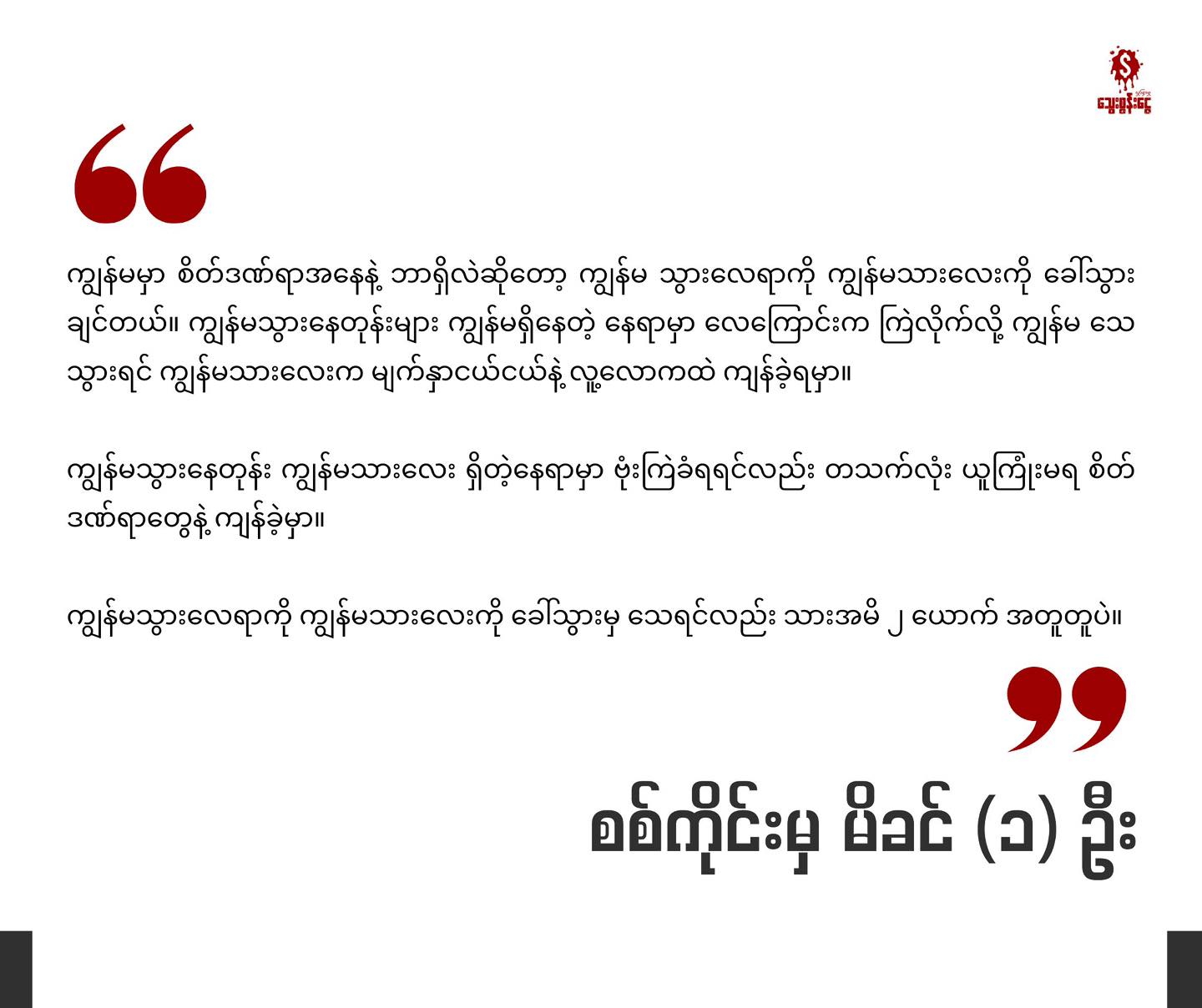 “ကျွန်မမှာ စိတ်ဒဏ်ရာအနေနဲ့ ဘာရှိလဲဆိုတော့ ကျွန်မ သွားလေရာကို ကျွန်မသားလေးကို ခေါ်သွားချင်တယ်။ ကျွန်မသွားနေတုန်းများ ကျွန်မရှိနေတဲ့ နေရာမှာ လေကြောင်းက ကြဲလိုက်လို့ ကျွန်မ သေသွားရင် ကျွန်မသားလေးက မျက်နှာငယ်ငယ်နဲ့ လူ့လောကထဲ ကျန်ခဲ့ရမှာ။ ကျွန်မသွားနေတုန်း ကျွန်မသားလေး ရှိတဲ့နေရာမှာ ဗုံးကြဲခံရရင်လည်း တသက်လုံး ယူကြုံးမရ စိတ်ဒဏ်ရာတွေနဲ့ ကျန်ခဲ့မှာ။ ကျွန်မသွားလေရာကို ကျွန်မသားလေးကို ခေါ်သွားမှ သေရင်လည်း သားအမိ ၂ ယောက် အတူတူပဲ။”