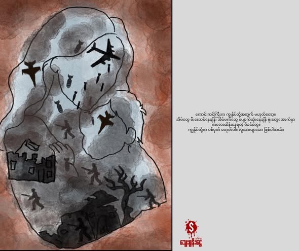 ကောင်းကင်ကြီးက သက်တန့်ကိုပဲ ယူလာသင့်တယ်၊ စစ်လေယာဉ်တွေမဟုတ်ဘူး။ သို့သော် မြန်မာနိုင်ငံက ကလေးတွေအတွက်တော့ ကောင်းကင်ကြီးရဲ့အသံက ဗုံးကြဲသံတွေသာ… အိပ်မက်တွေမဟုတ်၊ ရယ်မောသံတွေမဟုတ်ဘဲ အကြောက်တရားသာ… “The sky should bring rainbows, not warplanes. But